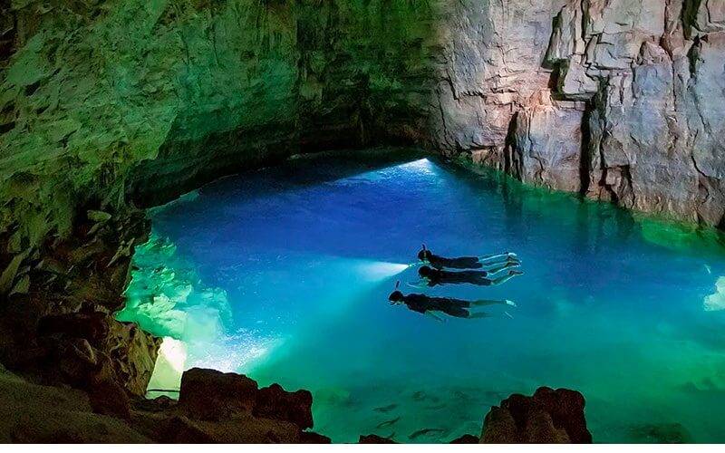 Na flutuação, o visitante entra na água utilizando equipamentos apropriados e permanece na superfície observando o fundo da caverna. A transparência da água permite visualizar formações rochosas submersas e detalhes do relevo calcário com muita nitidez.